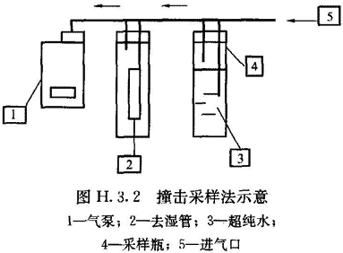 2 采樣瓶?jì)茸⑷?0mL超純水,用管子按圖H.3.2所示將各部分連接起來(lái)。去濕管是為了保證沒(méi)有水滴被吸入采樣泵。