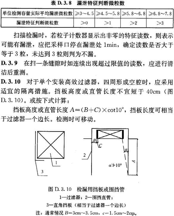 D.1.4 粒子計數器法適用于所有等級的潔凈場(chǎng)所過(guò)濾器檢漏,適用過(guò)濾器最大穿透率低至0.0000005%或更低。