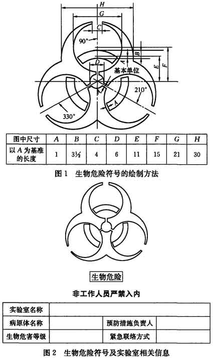 4.2.8 二級、三級、四級生物安全實(shí)驗室的操作對象都不同程度地對人員和環(huán)境有危害性,因此根據國際相關(guān)標準,生物安全實(shí)驗室入口處必須明確標示出國際通用生物危險符號。生物危險符號可參照圖1繪制。在生物危險符號的下方應同時(shí)標明實(shí)驗室名稱(chēng)、預防措施負責人、緊急聯(lián)絡(luò )方式等有關(guān)信息,可參照圖2。