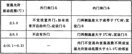 8.1.12 工藝性空氣調節區的門(mén)和門(mén)斗應符合表8.1.12的規定。外門(mén)門(mén)縫應嚴密,當門(mén)兩側的溫差大于或等于7℃時(shí),應采用保溫門(mén)。